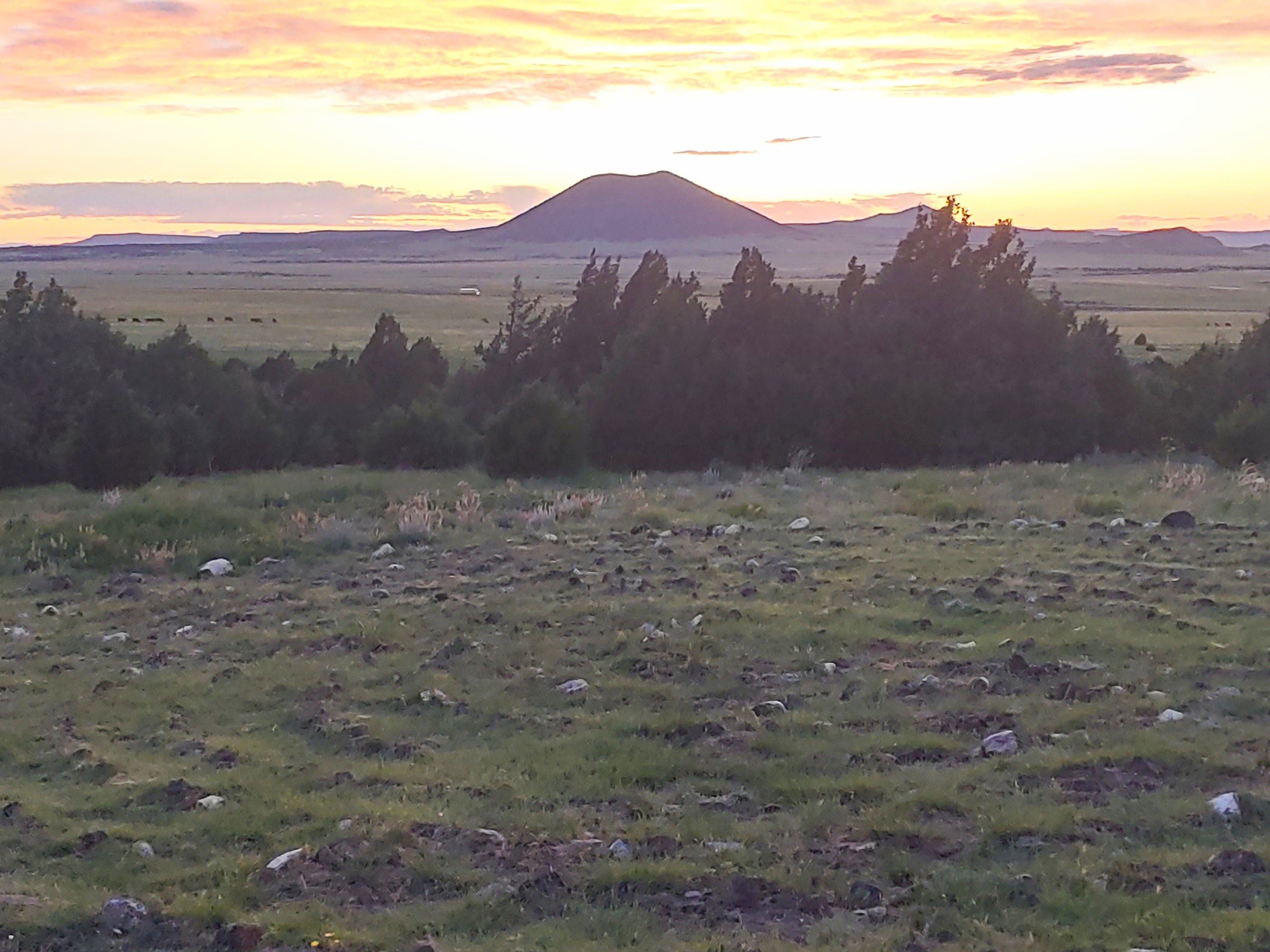 Also, one key aspect of the power of these days was the landscape itself. The sanctuary sits next to Capulin Volcano, and the land is peppered with chunks of volcanic rock. These two photos show the rock, as well as the labyrinth that is there, with the volcano in the background at sunset.